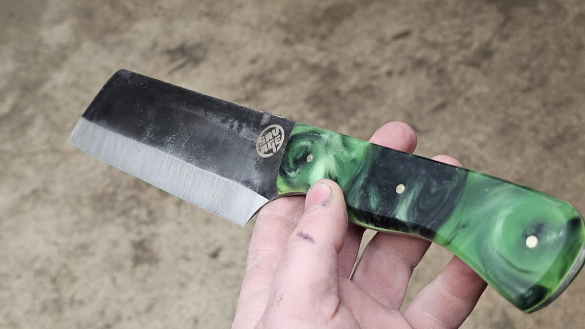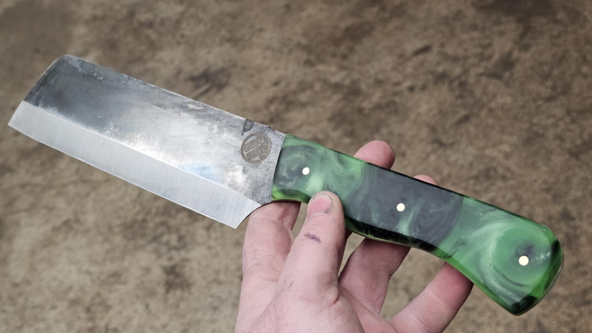Need a new knife for your kitchen? How about this slick custom cleaver with a gorgeous green & black resin handle!