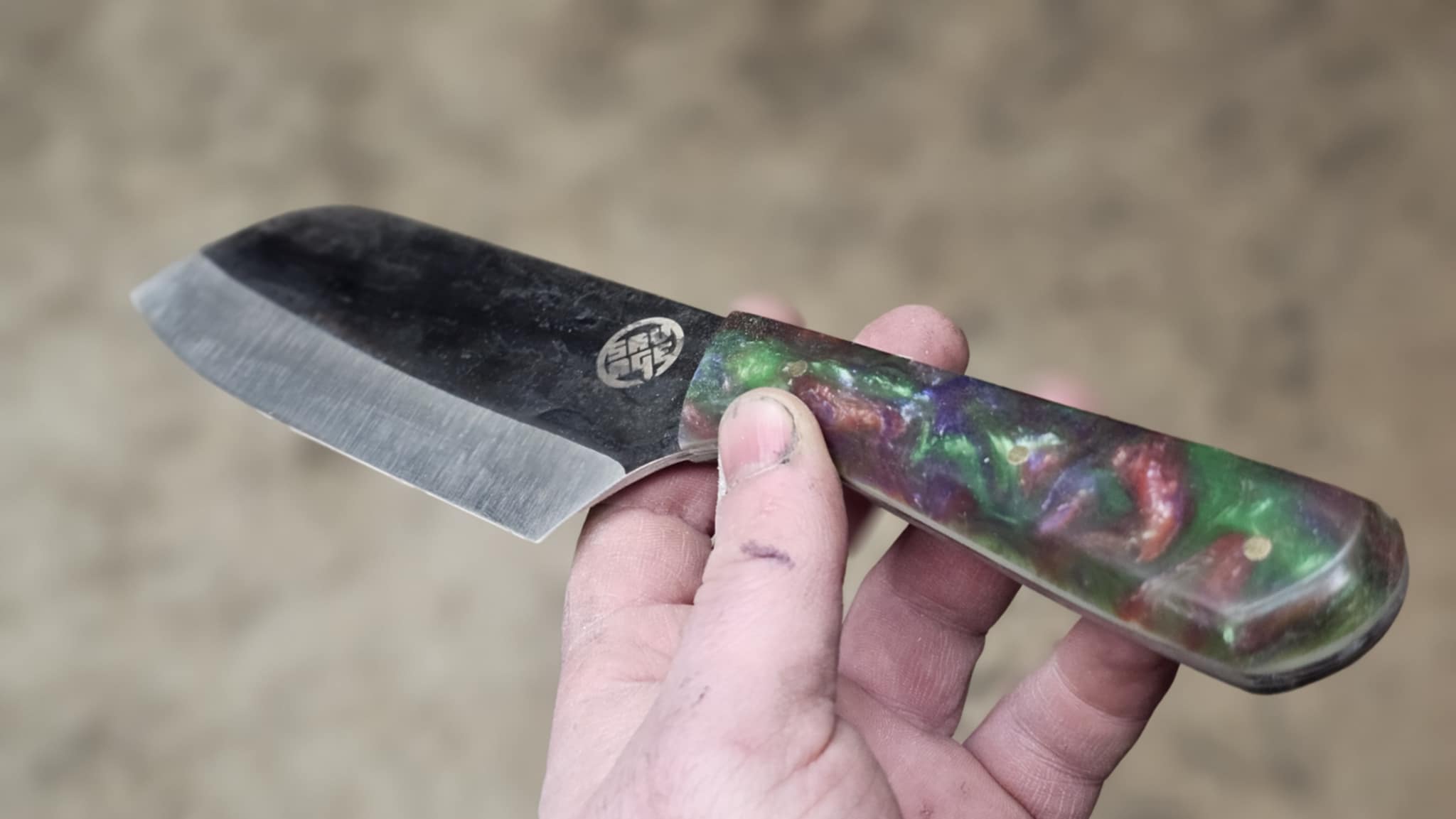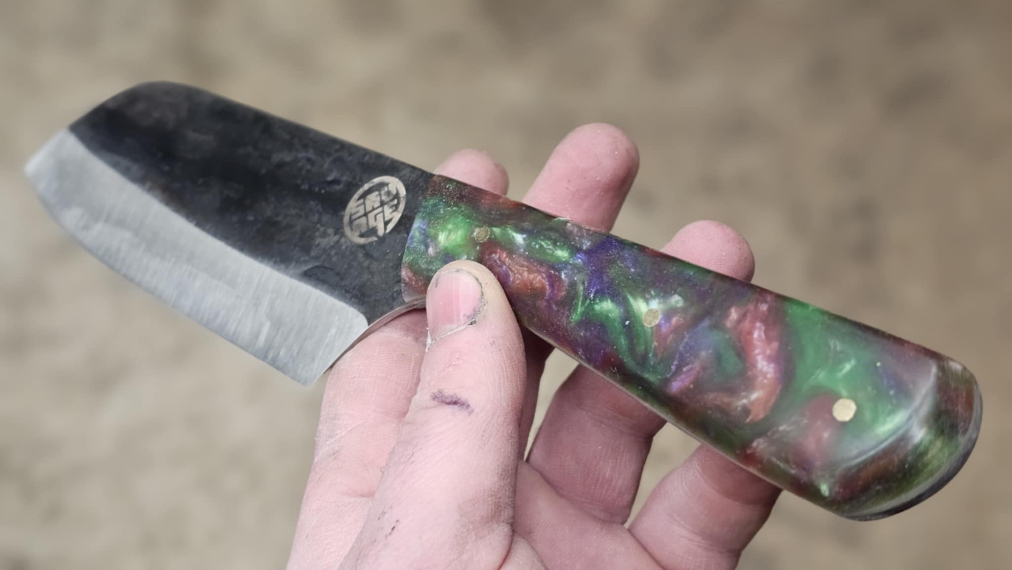 A beautiful stainless steel Santoku knife with a stunning green, purple, & red resin handle! A perfect general purpose knife.