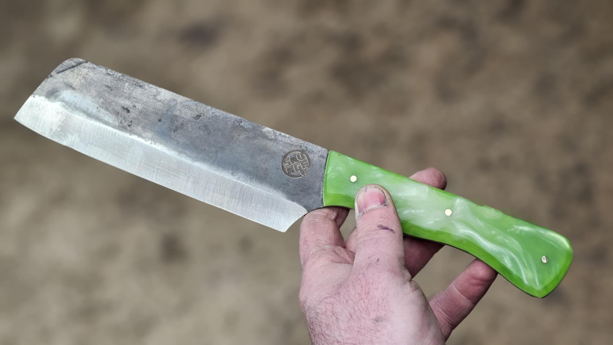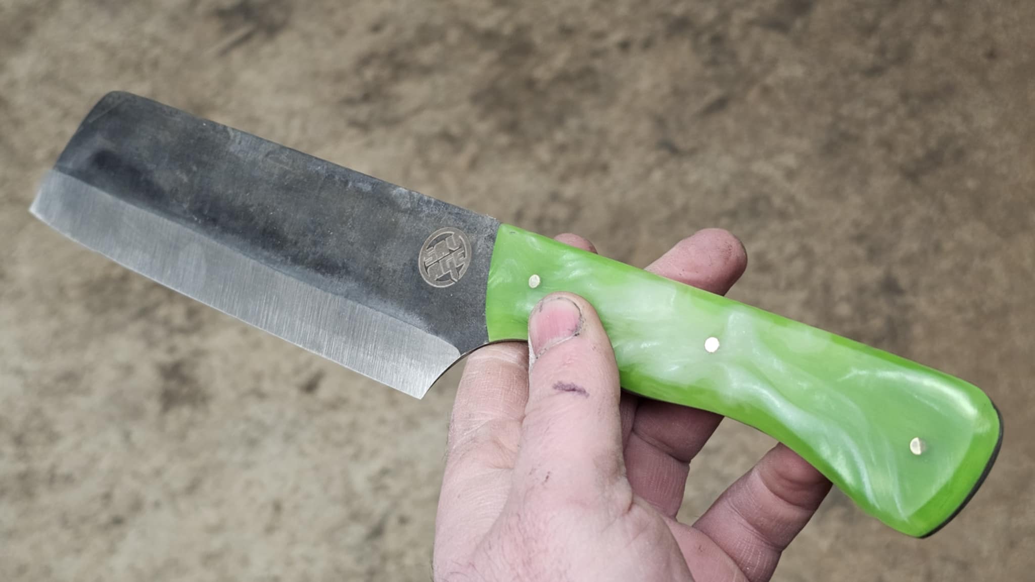 Need a new knife for your kitchen? How about this slick custom cleaver with a gorgeous apple green & white handle!