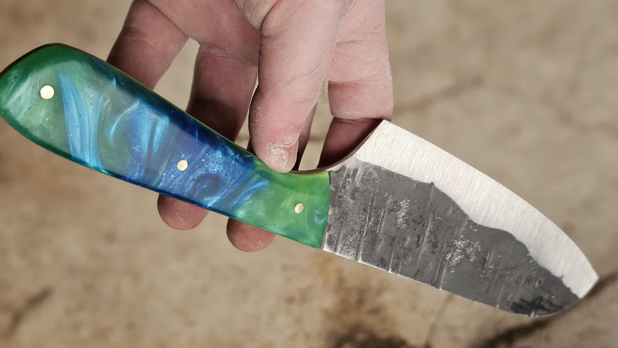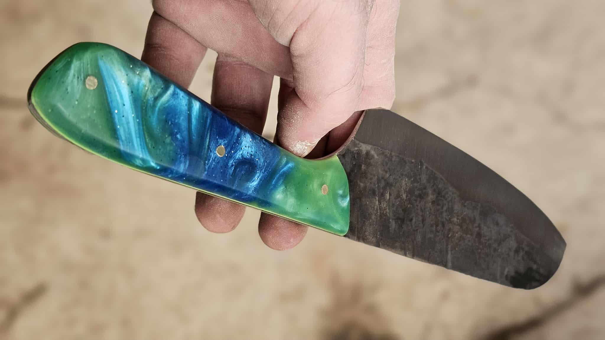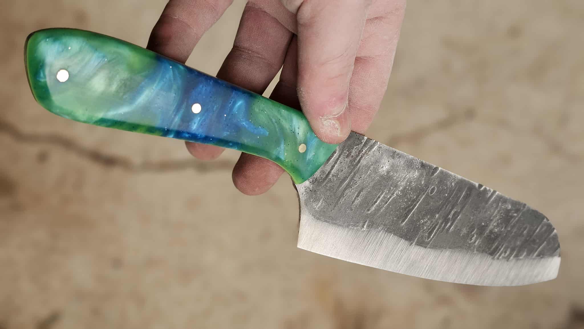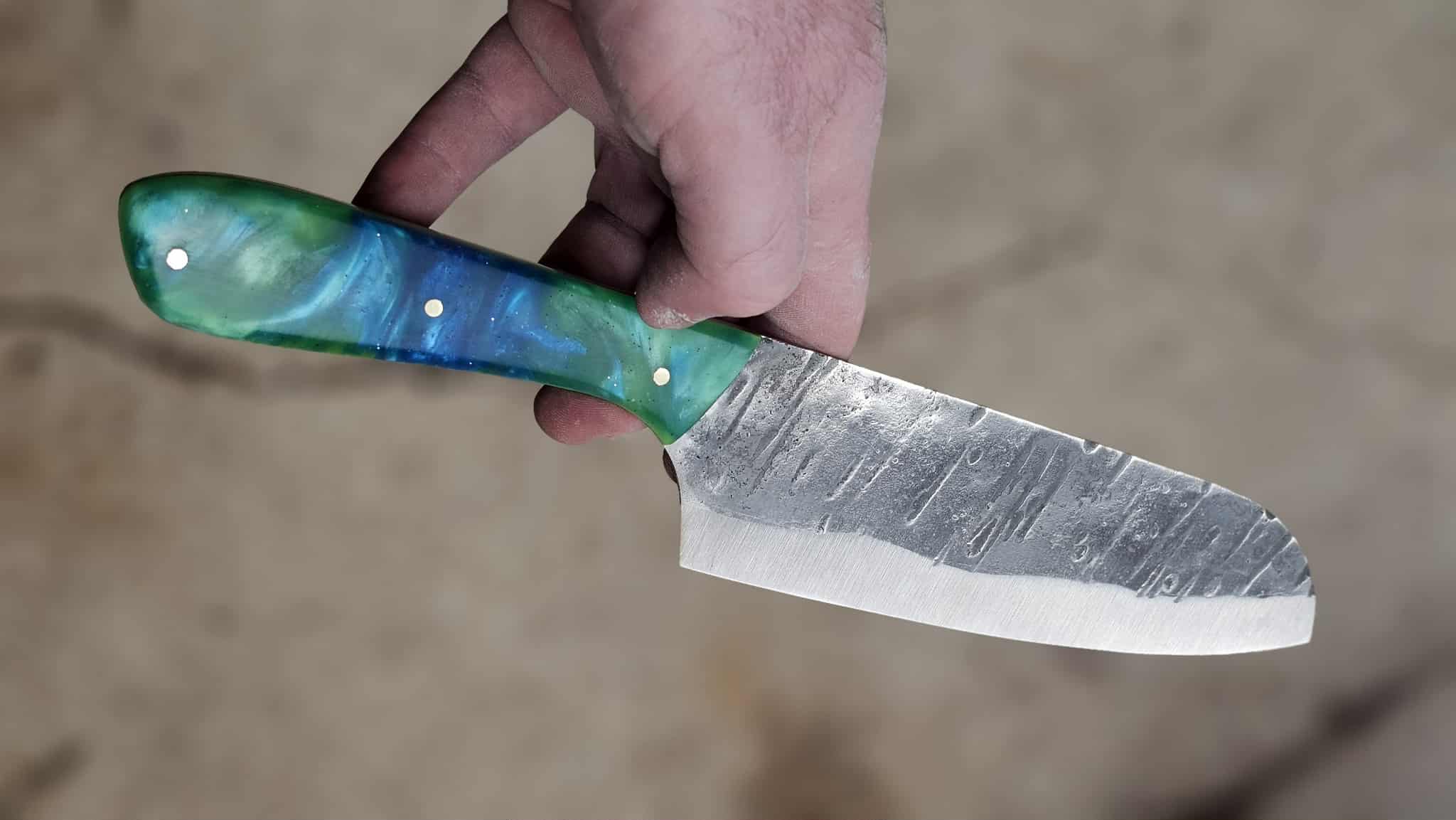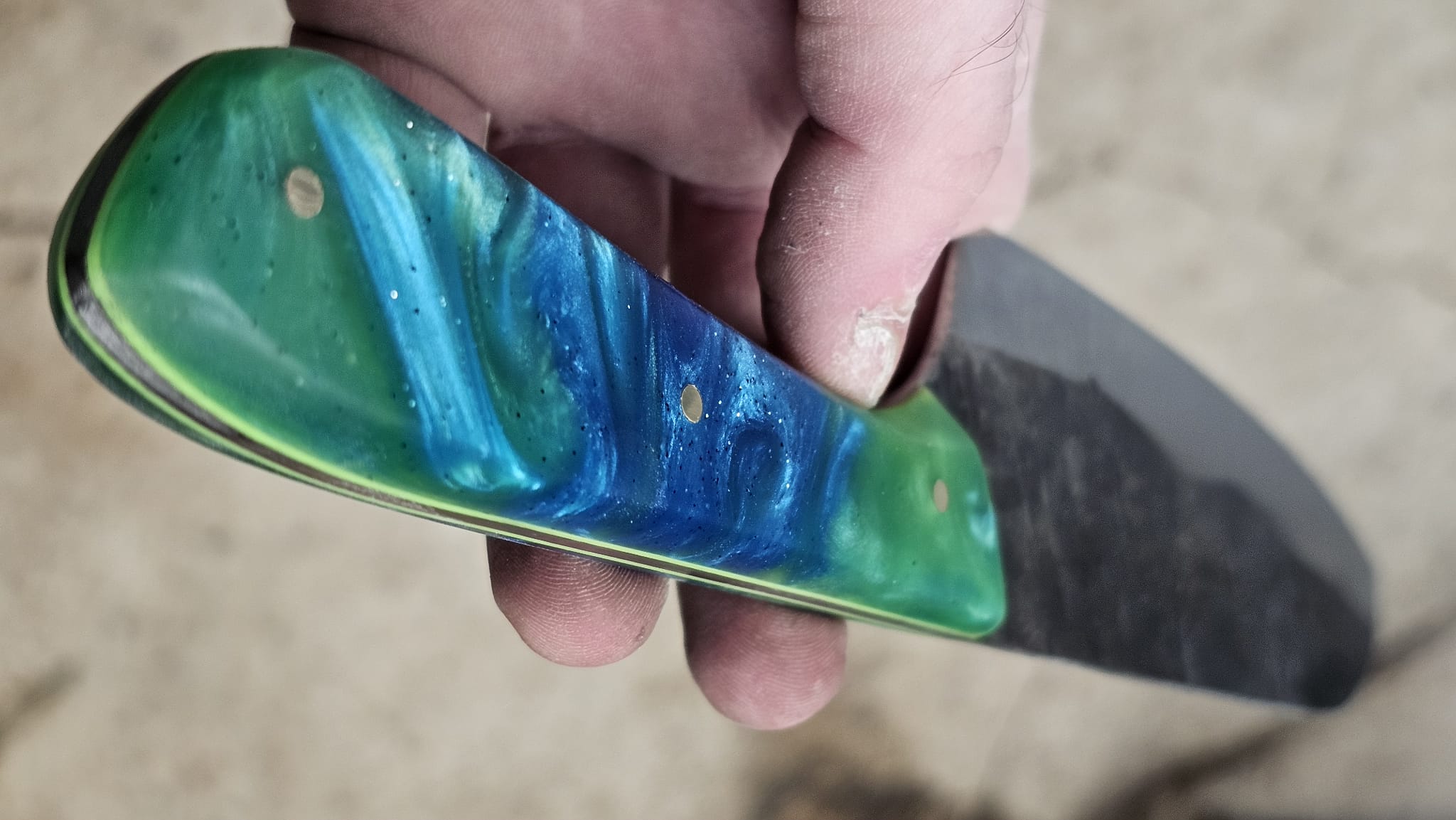 A beautiful stainless steel Santoku knife with a stunning blue & green resin handle! A perfect general purpose knife.
